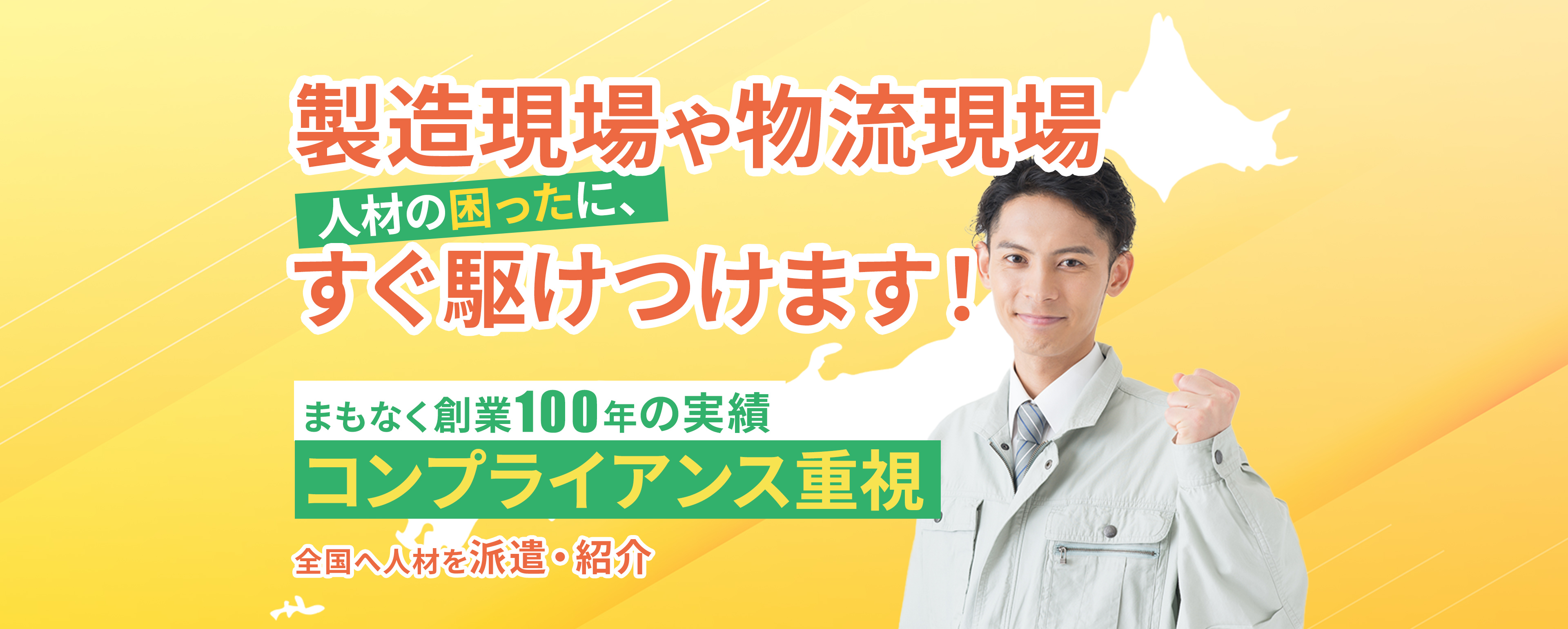 近くの拠点からすぐに伺います - 必要なエリアに人材を派遣するために、サービス拠点は全国に構えています。また従業員のための寮・住まいの提供を全国で行っていますので、必要な人材を必要な地域に派遣できる仕組みが整っています。